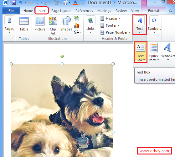 Sau khi đã chèn ảnh vào Word, bạn tiến hành chèn Text bằng cách : Insert -> Text -> TextBox